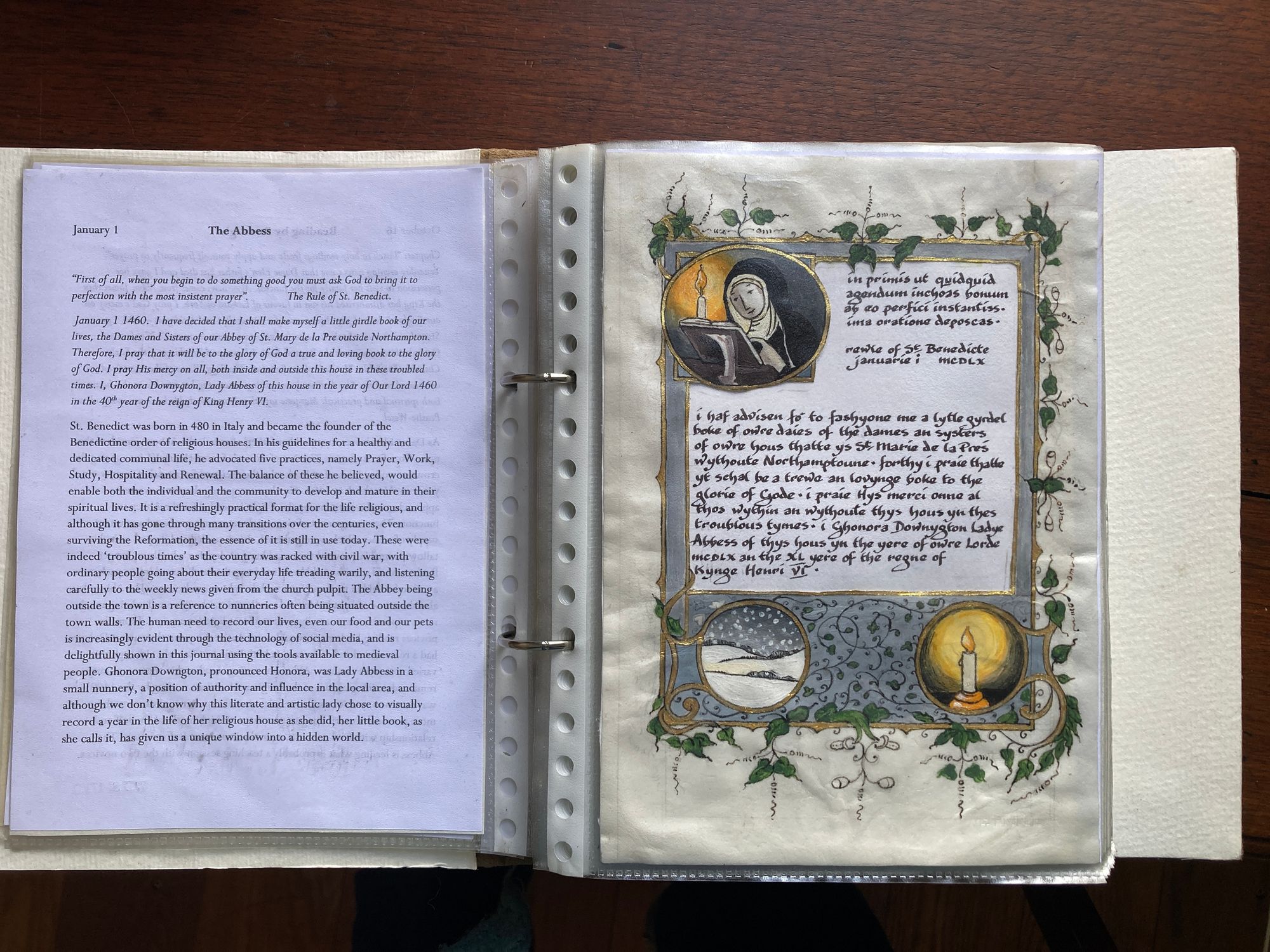 The answer was to make it visual. I am an artist, not a writer, so taking the idea from my own sketchbook journals, I decided to gather all my research into a personal illustrated diary of an Abbess of Delapre Abbey covering the year 1460. The diary would be highly illustrated and contain her writing of daily events and the workings of a monastic house. I also wanted to include some notes on the opposite page, including a modern translation of her writing and a simple explanation of the corresponding illustrations, together with information which I found fascinating. The format ended up looking like this -